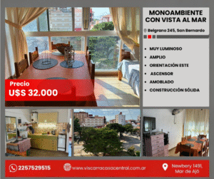 Belgrano 245, San BernardoAmplio monoambiente en excelente estado, ideal para disfrutar de la tranquilidad y la hermosa vista al mar.